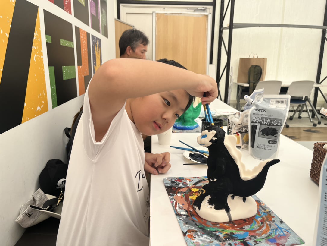 真っ白な素焼きのゴジラやモスラに好きな色を塗れる“色塗り体験”、