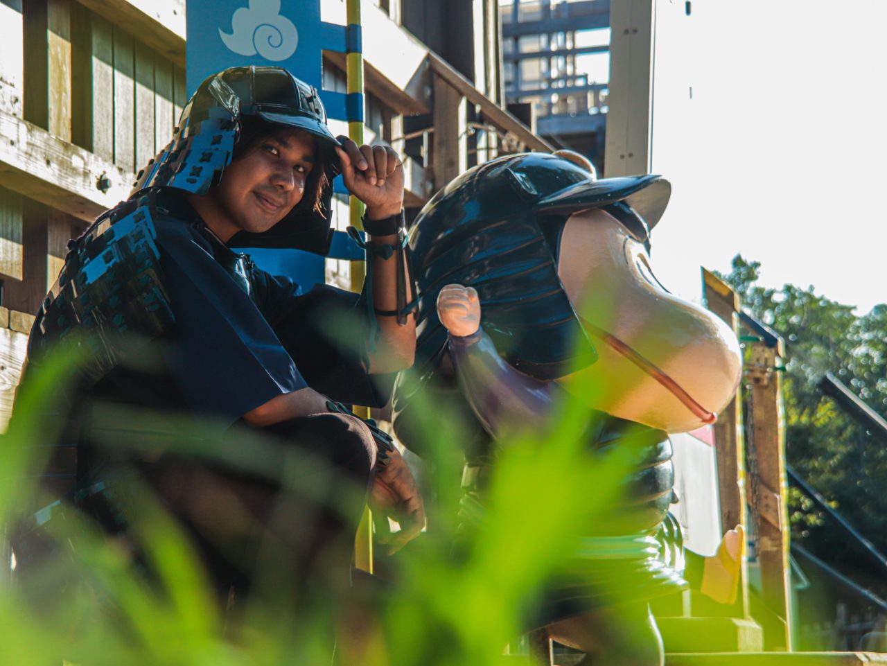 戦国時代さながらの雰囲気の中、自由に選べる“甲冑”を身にまとい、アスレチックにいざ出陣!