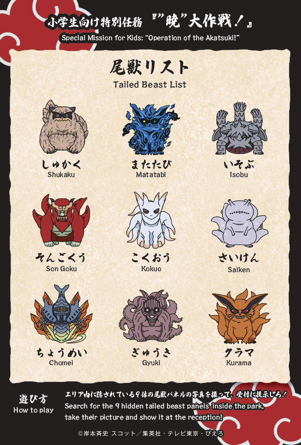 本任務(イベント)では、S級犯罪組織「暁」の一員を目指し、エリア内に潜む9体の“尾獣”を探し出すウォークラリーイベントに参加いただきます!スタート時に渡される「尾獣リスト」を頼りに里内を巡り、尾獣が描かれた9つのパネルの撮影して受付のスタッフに全ての写真を報告することで任務達成!