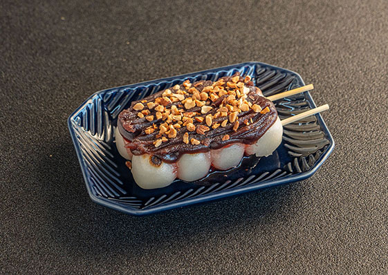 あんことナッツでゴジラの黒さとごつごつ感を表現した団子です。あんこの下にはストロベリーソースがかかっており、豊かな風味もお楽しみいただけます!