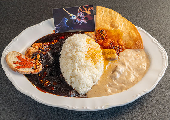 『ゴジラVSモスラ』をイメージしたダイナミックなカレー!ブラックカレーはゴジラ、ホワイトカレーはモスラをイメージし、2~3人前の超ボリュームとなっております!