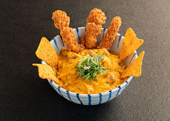 キングギドラを模したがっつり丼!親子丼ベースにチキンカツ・トルティーヤチップスを散りばめ体躯を表現したお腹いっぱい間違いなしの一品です。