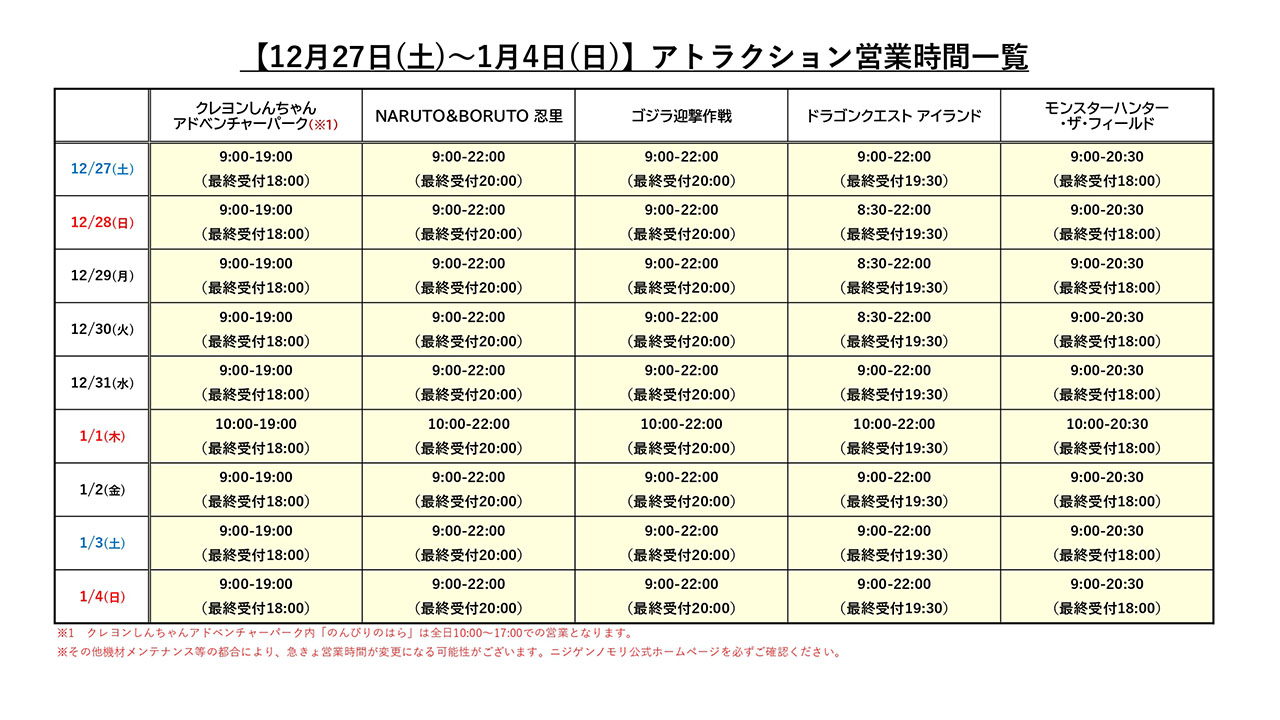 兵庫県立淡路島公園アニメパーク「ニジゲンノモリ」は、2025年末・2026年始も休まず営業いたします。ご家族やお友達皆様でのお出かけに、ぜひご利用くださいませ。