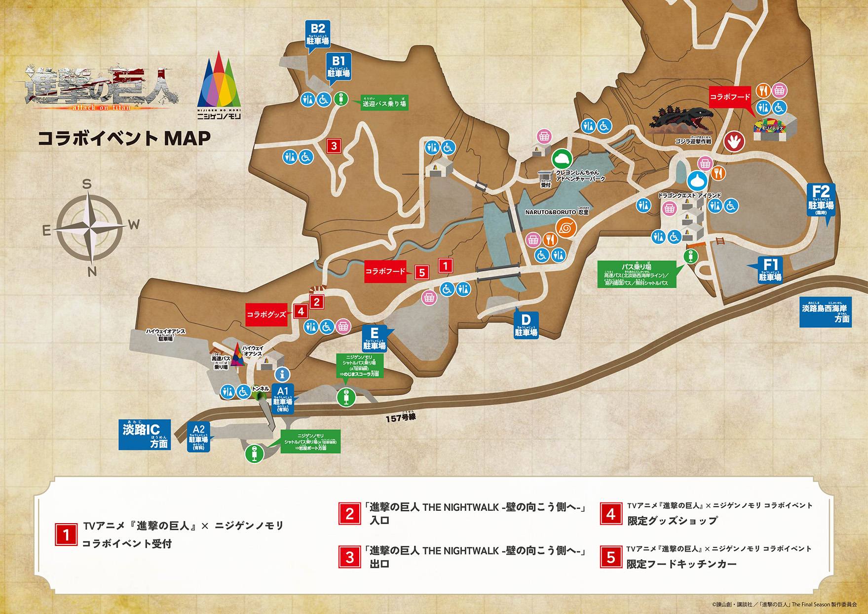自家用車で来園される方は、県立淡路島公園E駐車場がTVアニメ『進撃の巨人』×ニジゲンノモリ コラボイベント受付の最寄です。