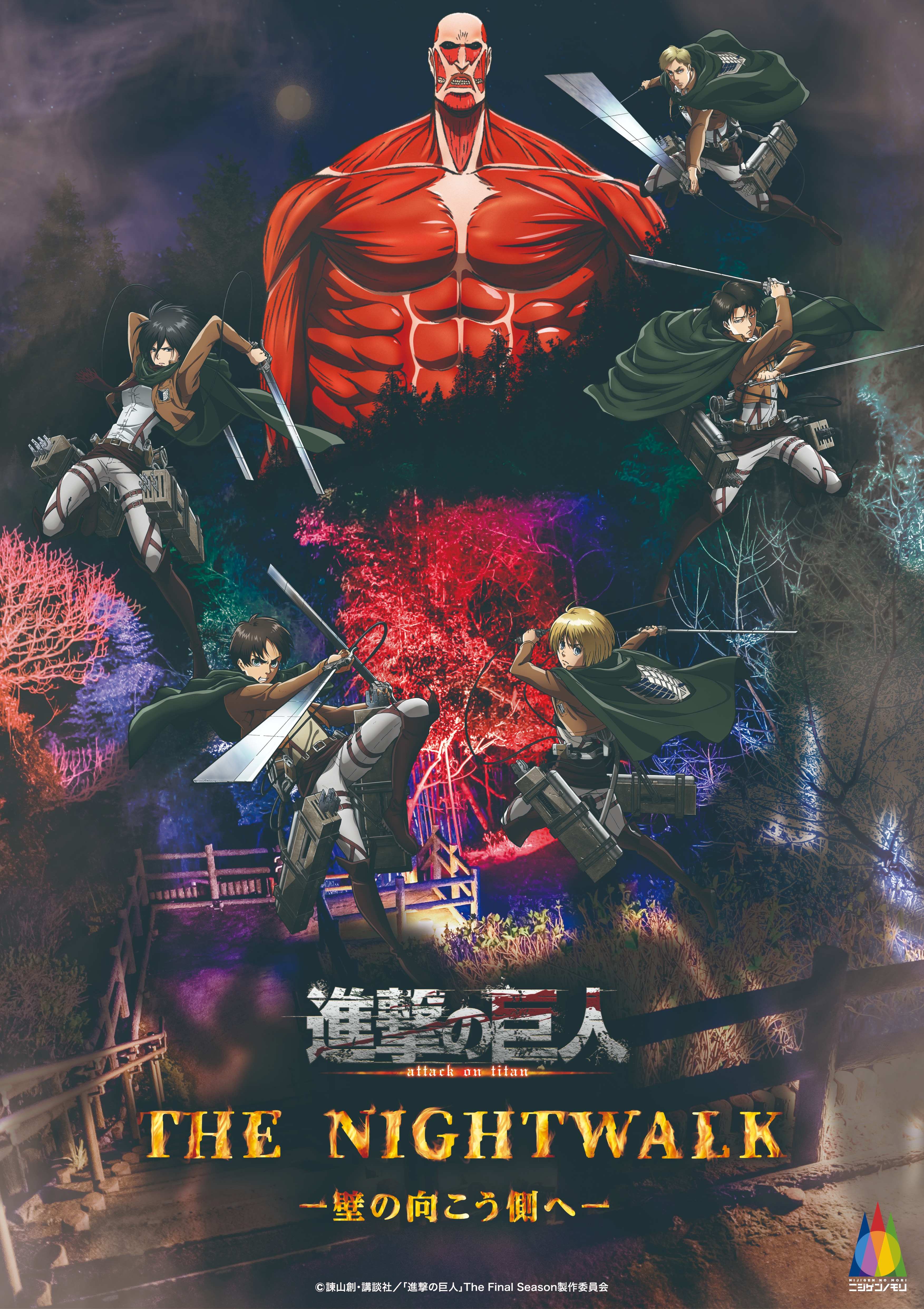 At night, "Attack on Titan THE NIGHTWALK - Beyond the Walls" allows you to experience the world of the TV anime "Attack on Titan" by walking through a 1.2km long forest illuminated with light and sound, and joining Eren Yeager and others in the fight to regain freedom from the threat of Titans.