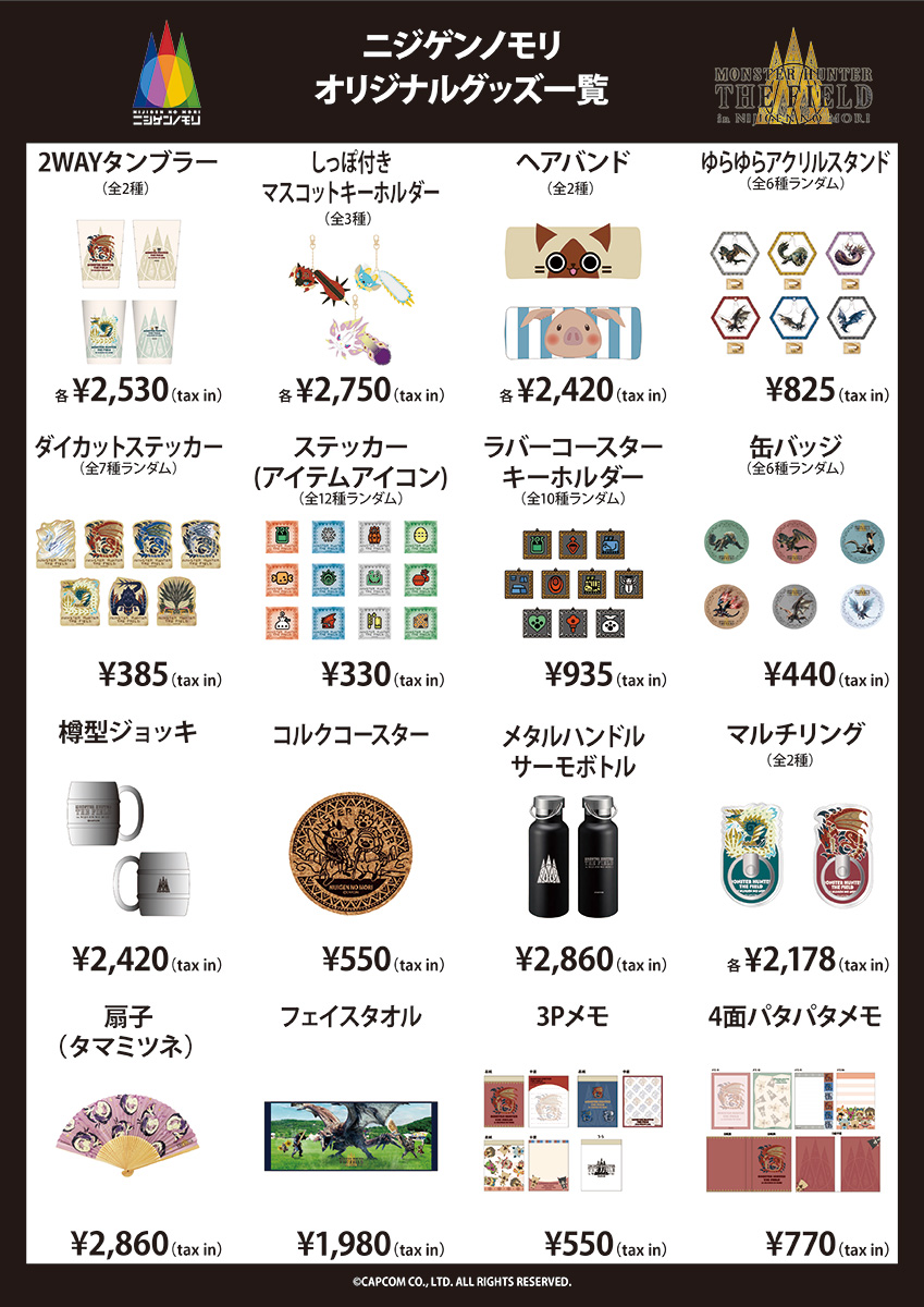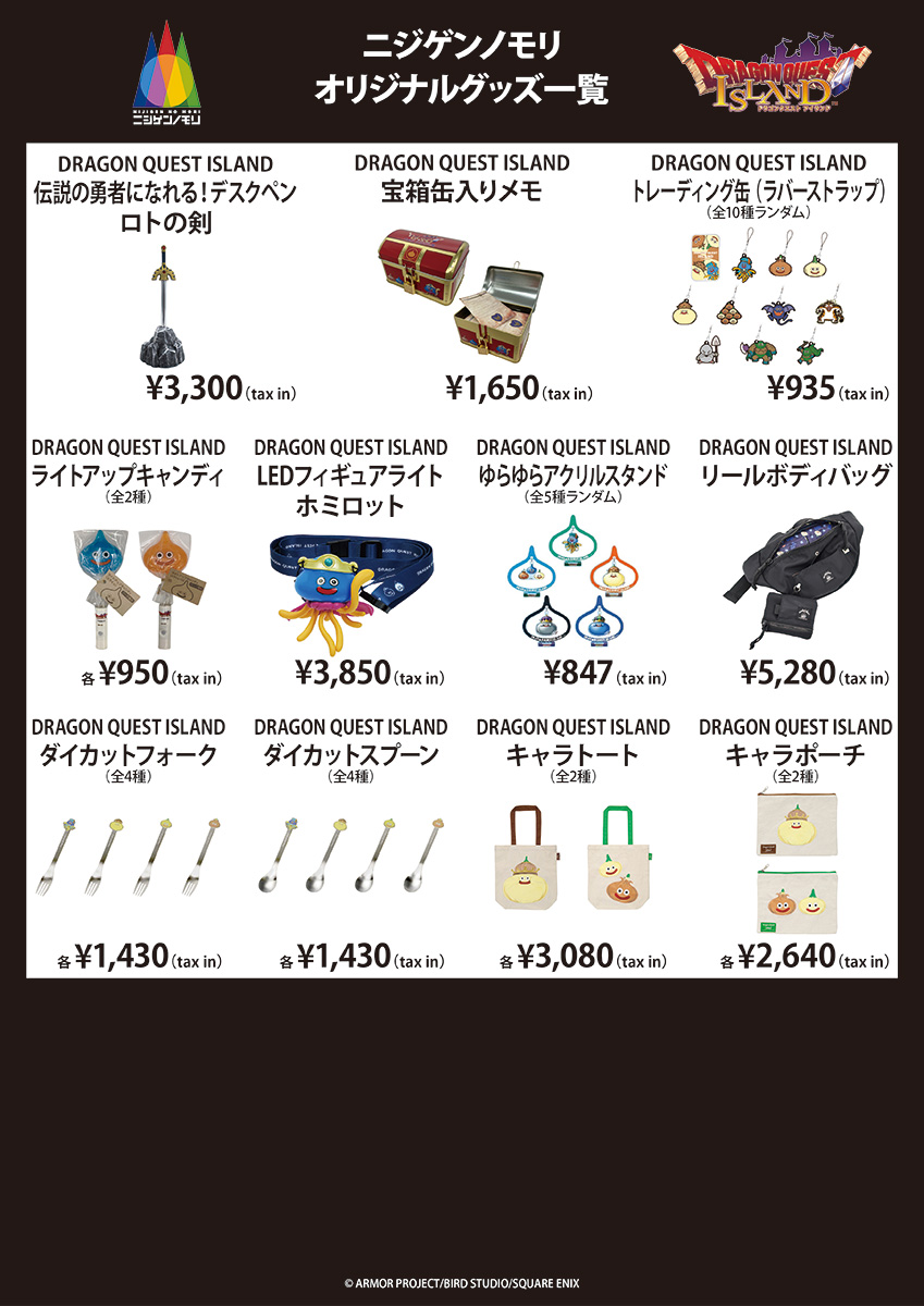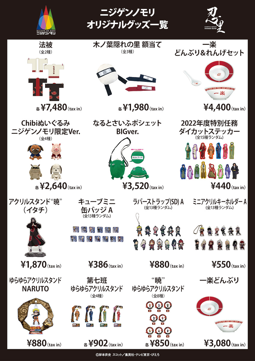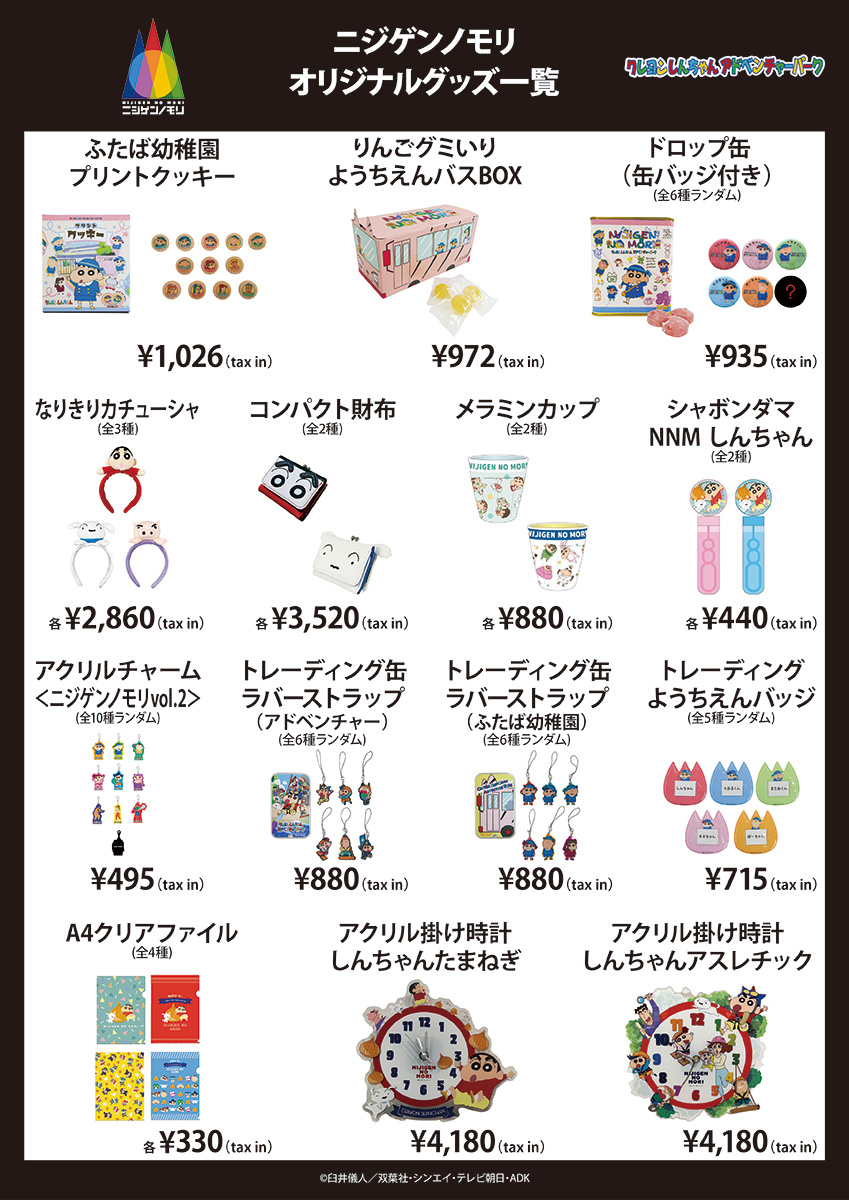 「크레용 신짱 어드벤처 파크」, 「NARUTO & BORUTO 시노부」, 「고질라 요격 작전」, 「드래곤 퀘스트 아일랜드」, 그리고 현재 개최중인 기간 한정 어트랙션인 「몬스터 헌터 더 필드 in 니지겐 노모리」에 더해, 올해 2월에 영업 종료한 「BLEACH 콜라보레이션 이벤트 상품을 판매!