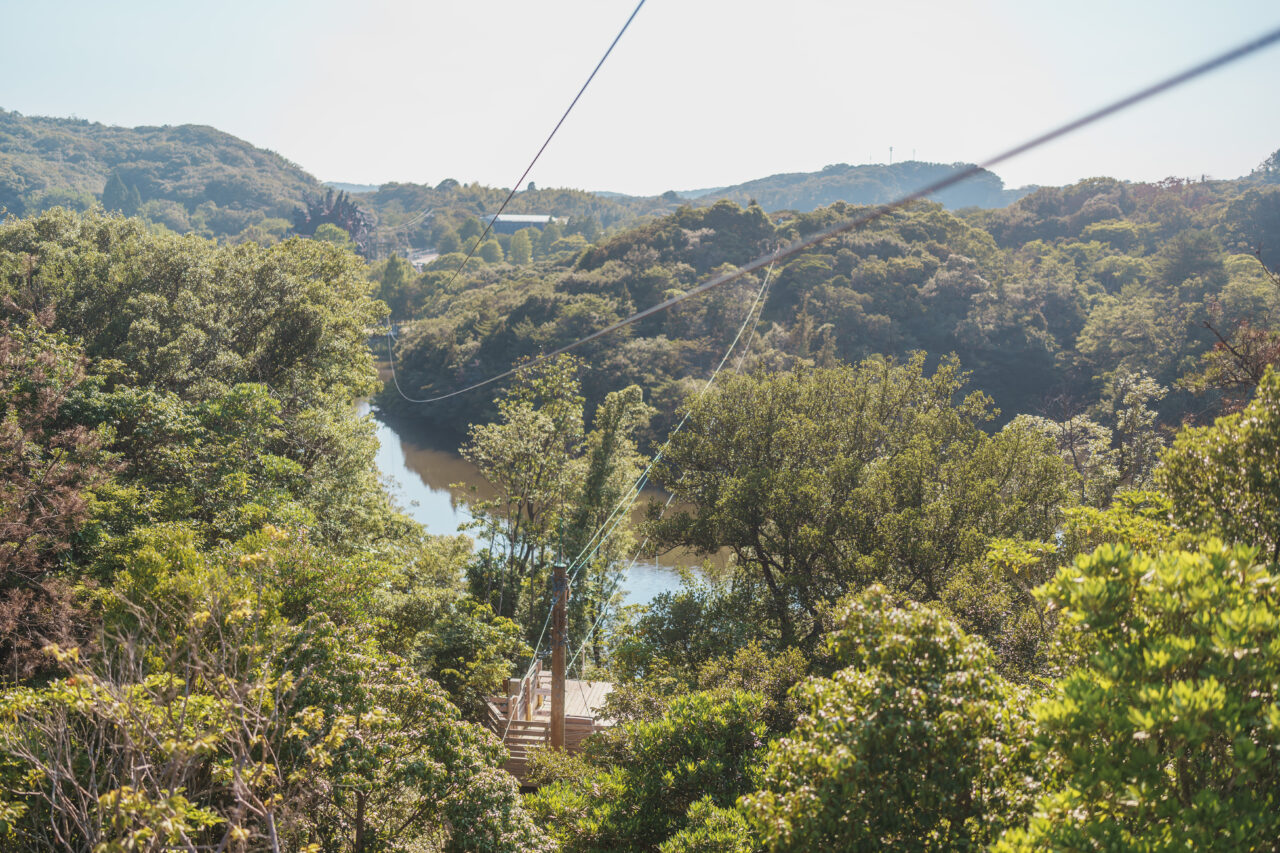 왕로는 225m!지상 8m 지점에 있는 스타트 데크에서 연못의 골목 지점까지 레일을 따라 미끄러져 내립니다! 기나 연못 위를 활공하는 체험은 다른 곳에서는 좀처럼 맛볼 수 없는 체험이에요!