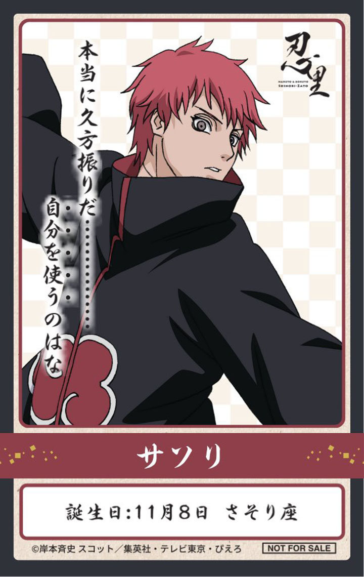 오늘 11월 8일은, 모래 은신처의 마을의 빠짐인이어 S급 범죄 조직 “새벽”의 멤버이기도 한 괴롭힘 “전갈”의 생일! 니지겐 노모리의 대인기 어트랙션 「NARUTO & BORUTO 시노부」에서는 전갈의 생일을 기념한 한정 스티커를 배포중입니다!