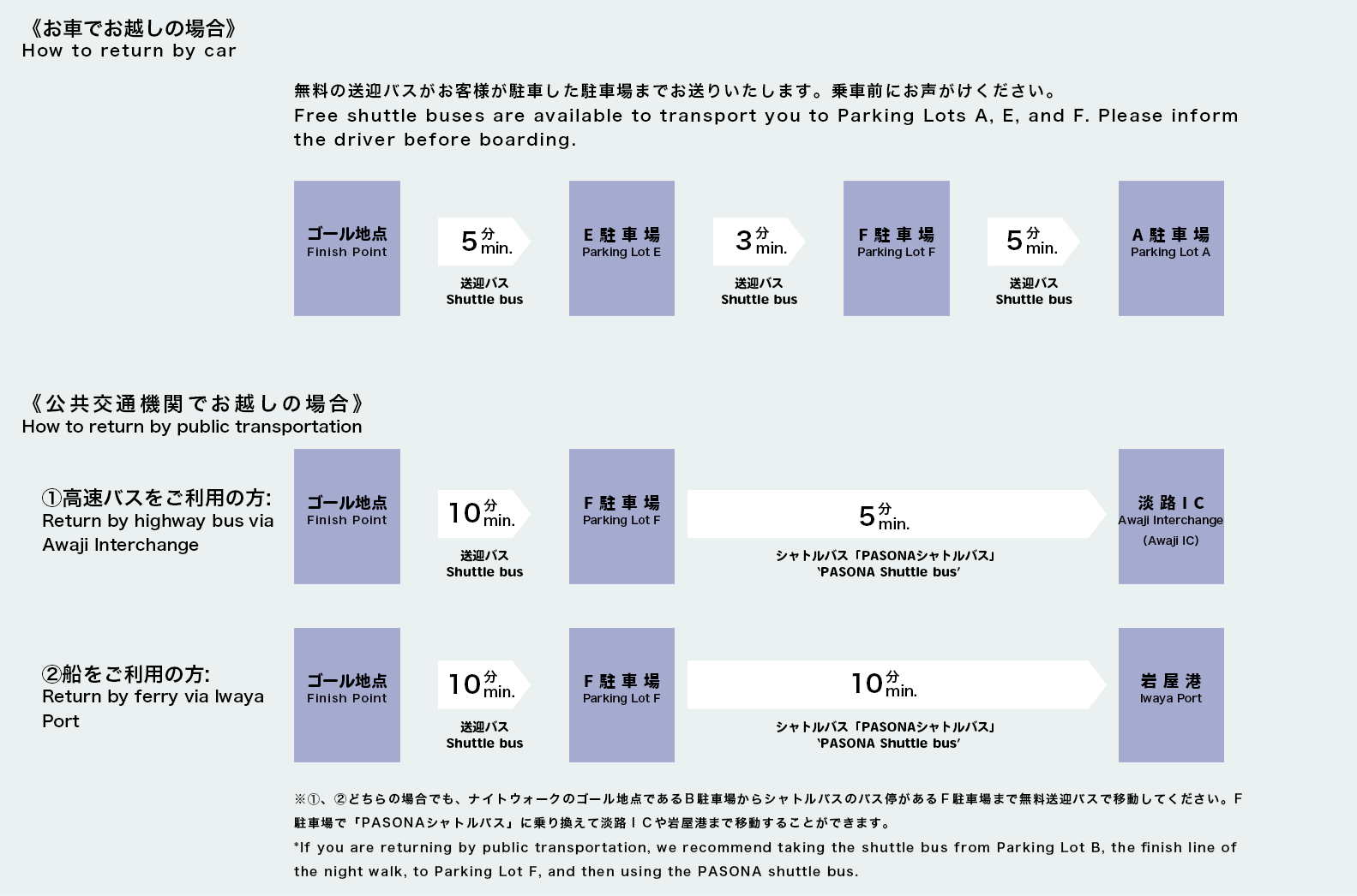 - 7. 배를 이용하여 아카시 방면으로 이동하는 경우, 아와지 제노바 라인의 아카시항 방면의 최종편은 '23:20 이와야항발'이 있지만, 니지겐 노모리에서 이와야항으로 향하는 PASONA 셔틀 버스는 '22:04 니지겐 노모리 F 주차장발'이 최종편입니다.