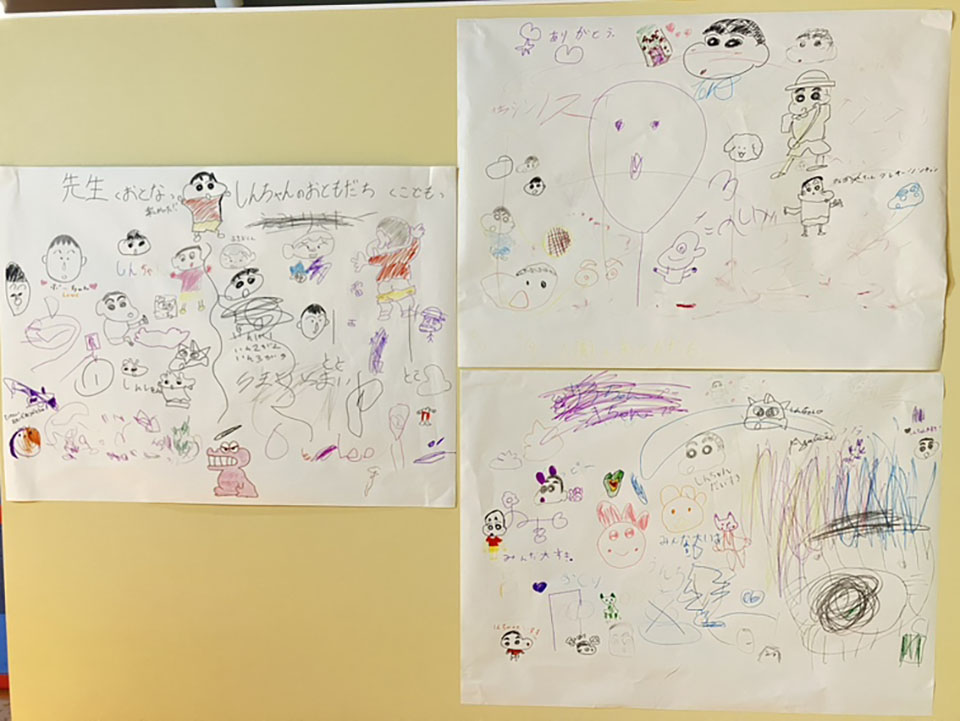 画满图画的纸张将在幼儿园展出!让我们用大家画的蜡笔小新和他的朋友们的图画来装饰双叶幼儿园的墙壁吧!