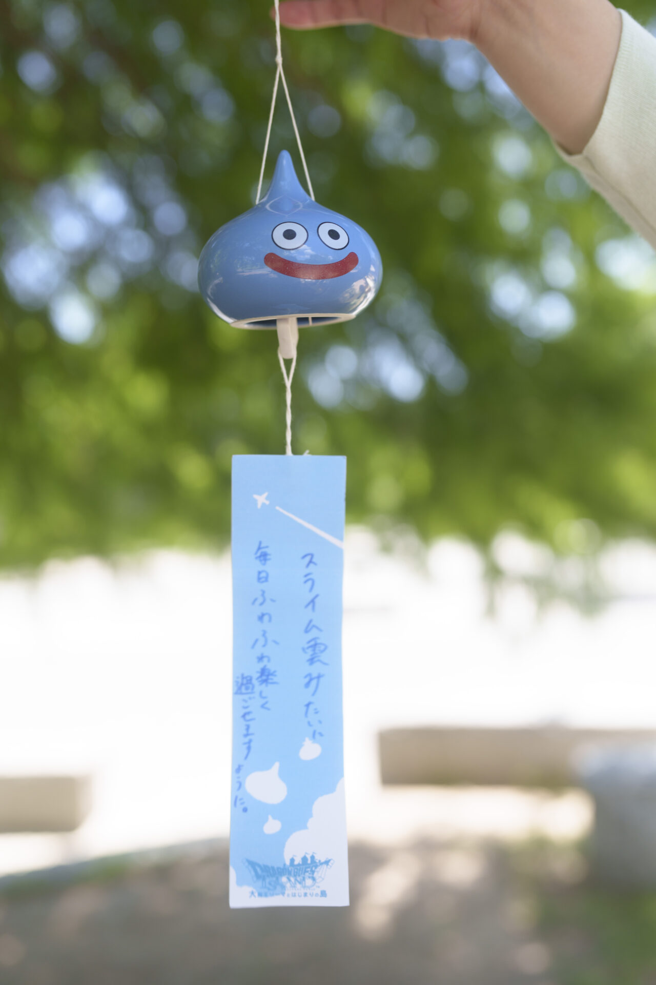 這次活動是夏日手工藝體驗活動,您可以將自己製作的原創紙條綁在超可愛的史萊姆造型風鈴上,製作出專屬於您的原創風鈴!在毗鄰勇者鬥惡龍島的“Onokogard工坊”,您可以從四張原創紙條中選擇一張,在上面寫上您喜歡的文字或圖片,然後將紙條綁在史萊姆造型的風鈴上,即可完成。這是一個短暫卻充滿心意的手作體驗。