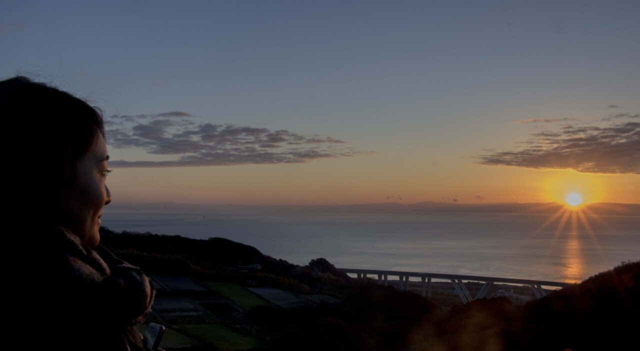 用暖手寶暖暖身子,然後從俯瞰明石海峽大橋和大阪灣的觀景台上欣賞今年的第一縷日出。