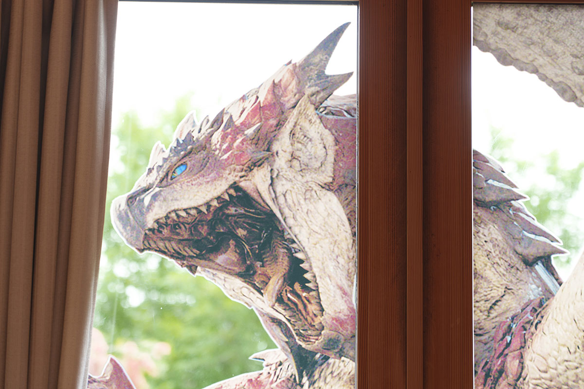 部屋に訪れるのは可愛らしいアイルーだけではありません…!なんと、寝室の窓には翼を大きく広げた迫力満点のリオレウスが!朝目覚めると、ハンターを狙って滑空してくるリオレウスとバッチリ目が合ってしまうかも…?! ある意味、目覚めスッキリかもしれません!