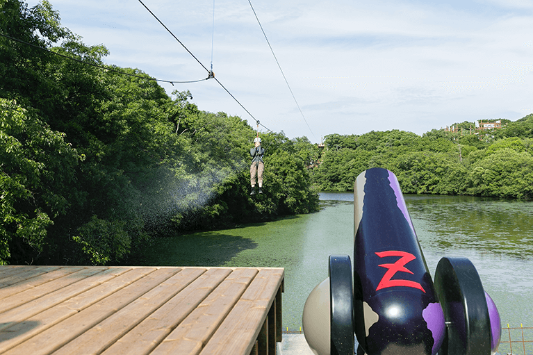Wearing an action mask helmet, you can enjoy the great outdoors on two round trip ziplines of 225m and 140m while surviving the attacks of the Black Mekemeke Gang's gigantic water guns!Let's enjoy the thrilling glide on the zipline!Both are attractions where you can experience the excitement that makes your heart beat like an action mask.