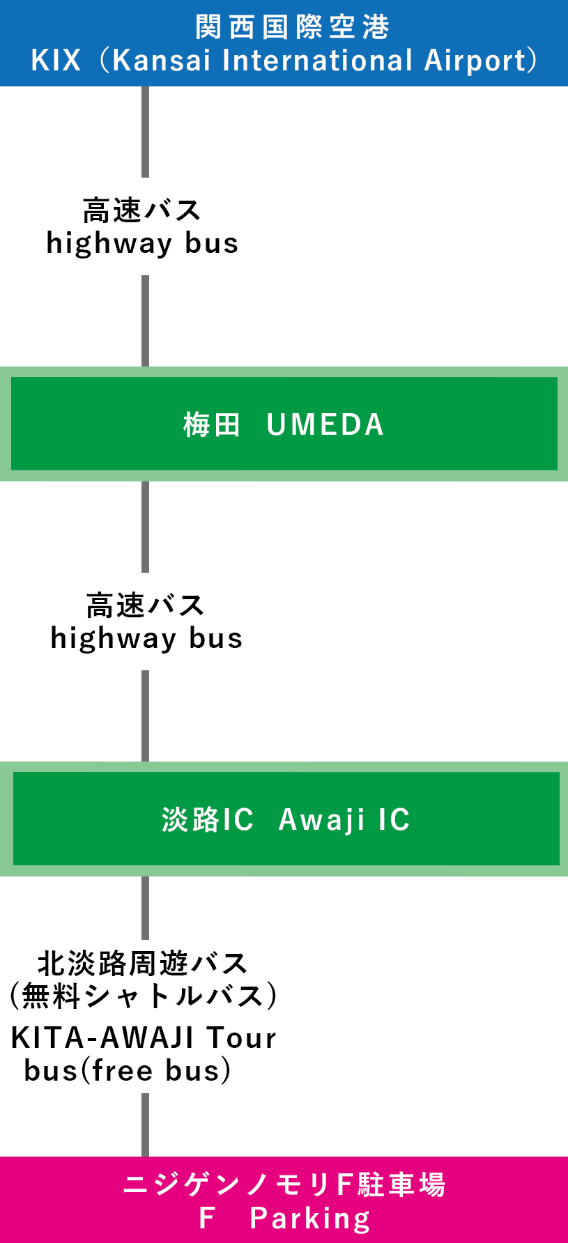 | 高速バスでの行き方 【淡路ICで乗り換え】 ①関西国際空港-淡路IC-ニジゲンノモリ(3時間~) ![]() |