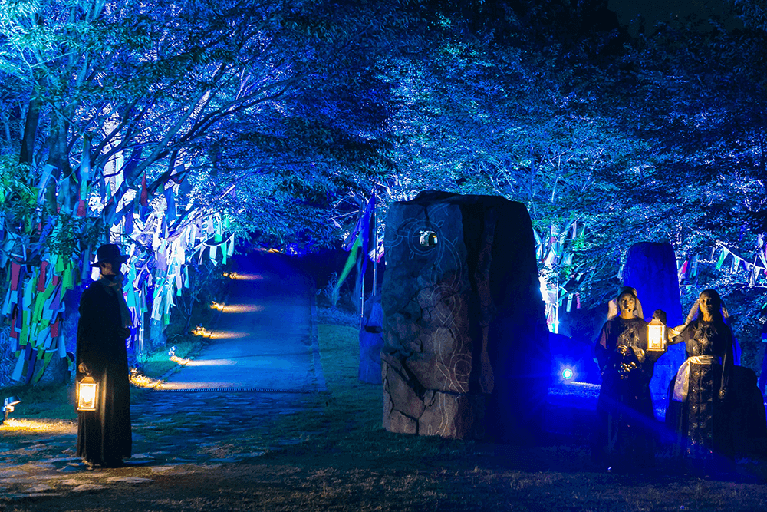 「나이트 워크 불의 새」는, 데즈카 오사무씨의 「불의 새」의 세계감을 소재로 한 스토리를 쫓으면서, 전체 길이 약 1.2 km의 어두운 숲 속을 스스로의 다리로 걸어 체험하는 어트랙션입니다 .