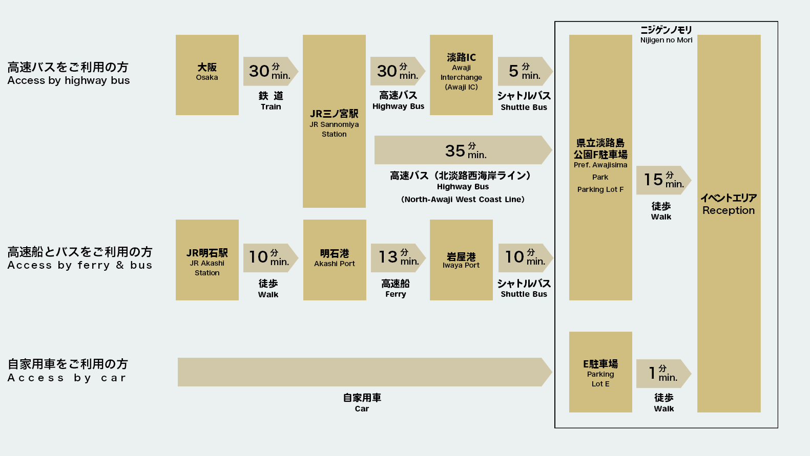 - 7. 배를 이용하여 아카시 방면으로 이동하는 경우, 아와지 제노바 라인의 아카시항 방면의 최종편은 '23:20 이와야항발'이 있지만, 니지겐 노모리에서 이와야항으로 향하는 PASONA 셔틀 버스는 '22:04 니지겐 노모리 F 주차장발'이 최종편입니다.