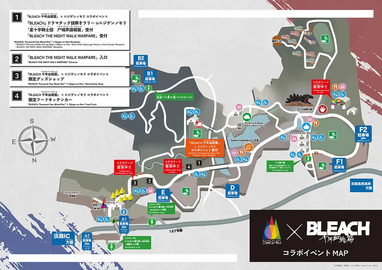 『BLEACH』 드라마틱 수수께끼 풀어 랠리 in니지겐노모리 성십자 기사단 범혼계 첩보편에 대해서, 이벤트 에리어내에는 충분히 포장되어 있지 않은 개소가 있습니다. 충분히 주의해 주십시오. - 안전상의 이유로 직원의 설명에 따라 규칙을 준수하고 참여하십시오. 코스 스탭의 설명이나 룰을 지키지 않고, 부상을 입었을 경우, 책임을 지지 않으므로 양해 바랍니다.