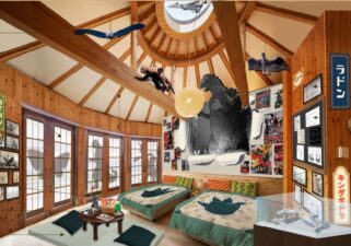 合作室的內部和掛毯描繪了過去的哥吉拉和流行的怪物,你可以透過窗戶看到哥吉拉真人大小的身體的一部分。這些裝飾品經過特殊處理,可根據光線改變外觀,讓您在白天和晚上享受不同的氛圍。
