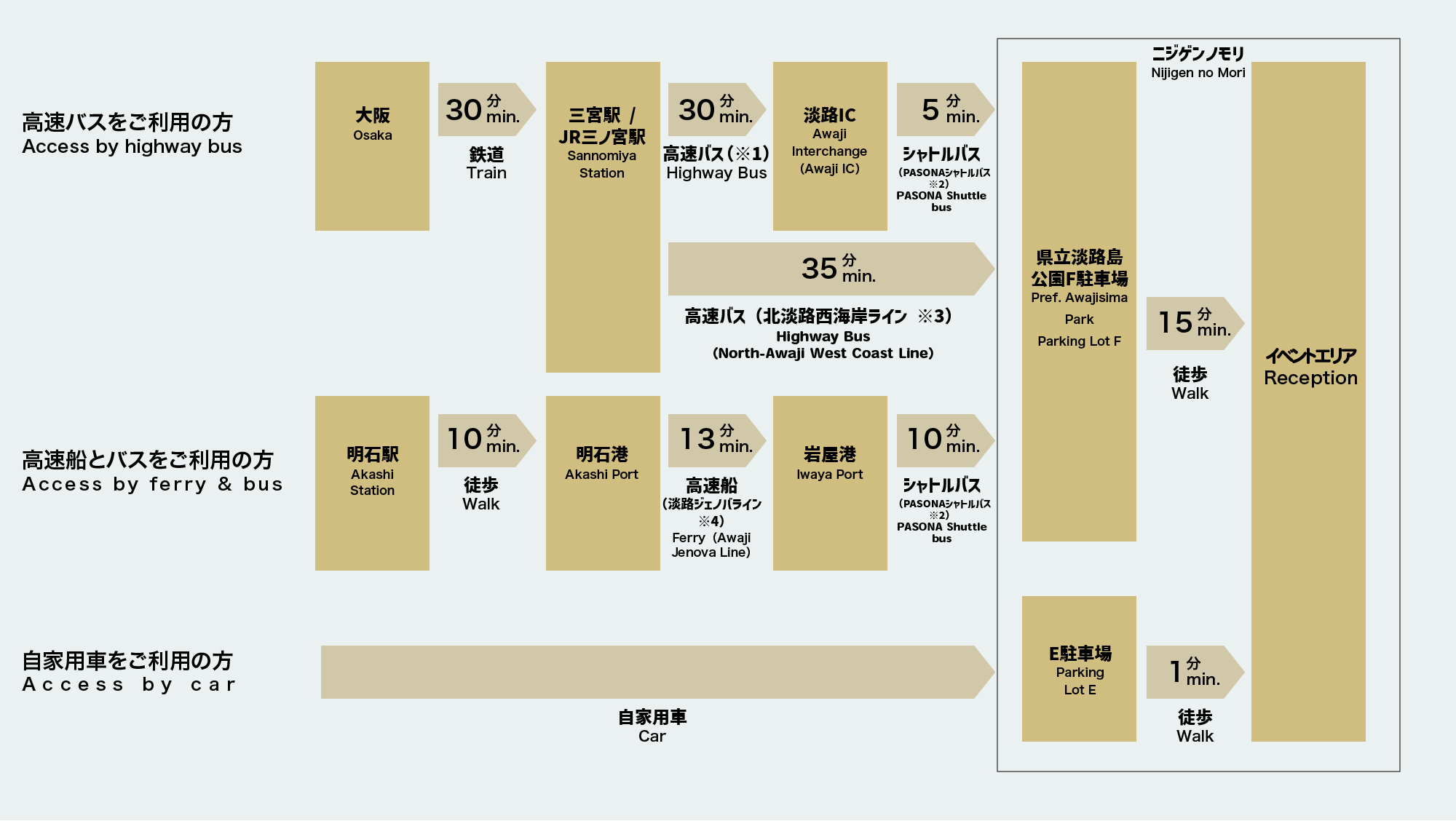 - 7.如果您搭船前往明石,淡路熱那亞線開往明石港的末班車時間為23:20從岩屋港出發,但PASONA接駁巴士從二次元之森開往岩屋港的末班車時間為22:04從二次元之森F停車場出發。