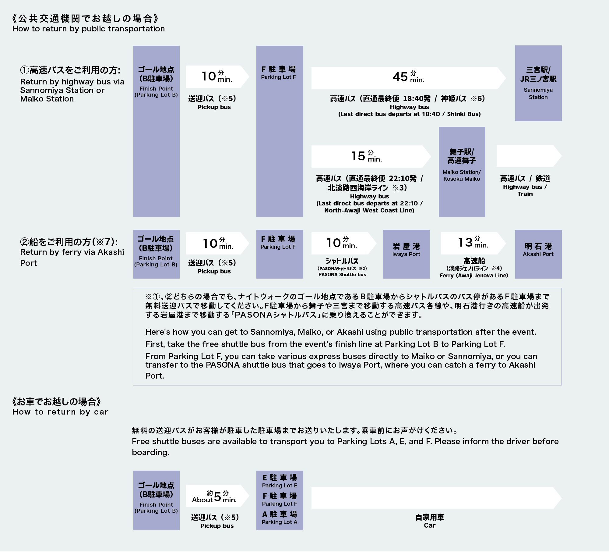 - 5.終點線(B停車場)、E停車場、F停車場、A停車場之間有免費接送巴士定期運行。