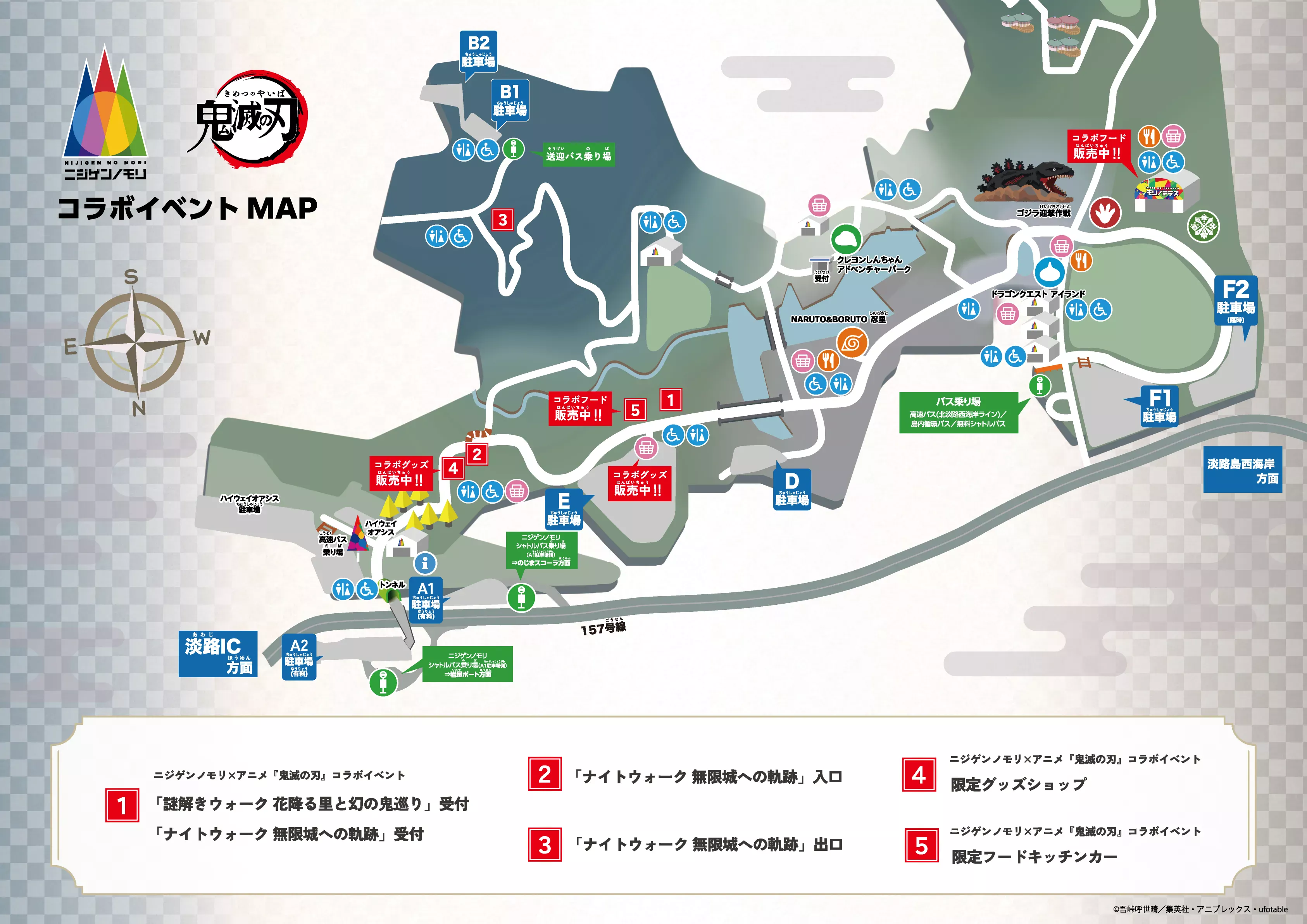 對於駕車而來的遊客來說,縣立淡路島公園停車場 E 是距離二次元之森 x 動畫《鬼滅之刃》合作活動場地最近的地方。